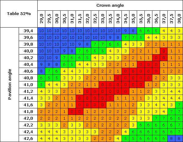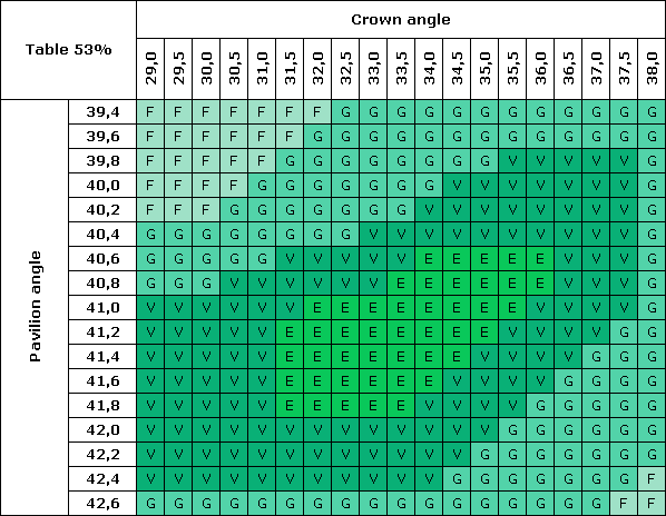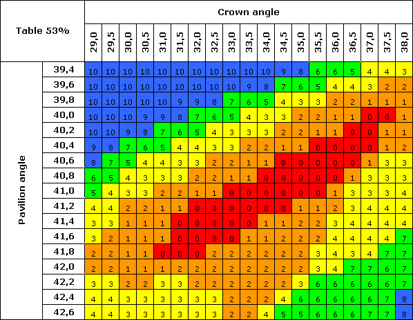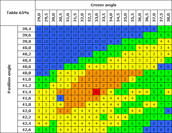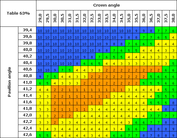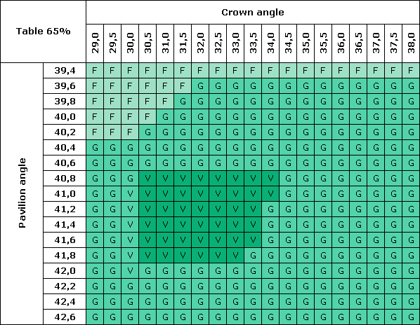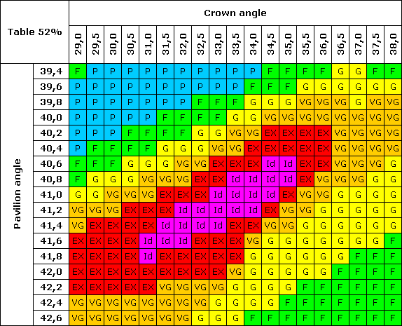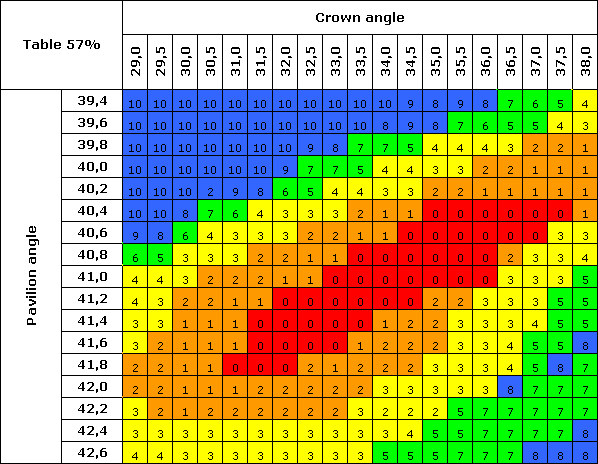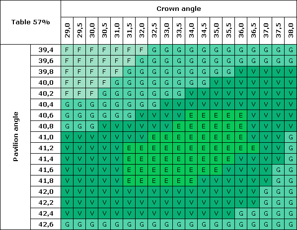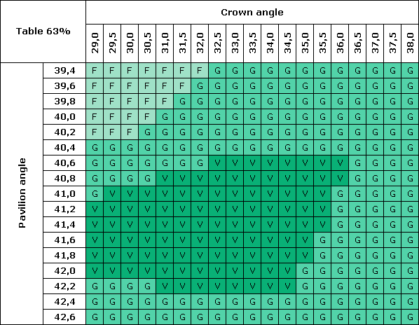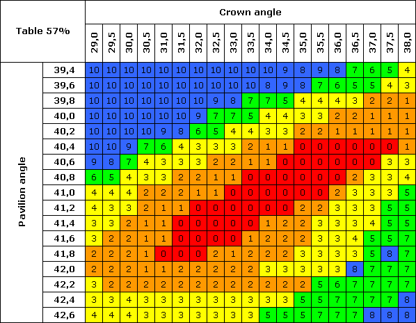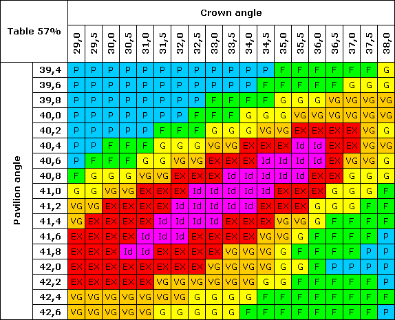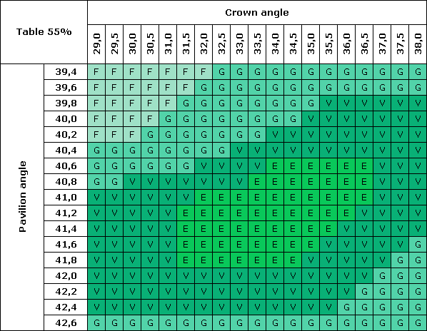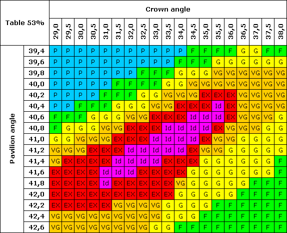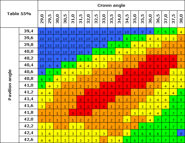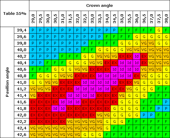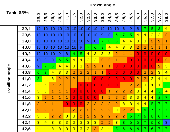 of AGS Performance Grading SoftwareŽ Parameters used in PGS: 3% girdle bezel, 55% Star (45% upper girdle) and 80% lower girdle facet length (81.5% lower facet depth). |