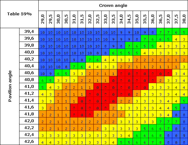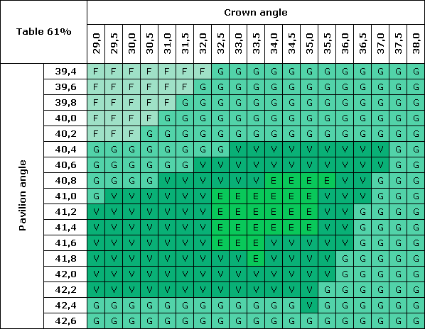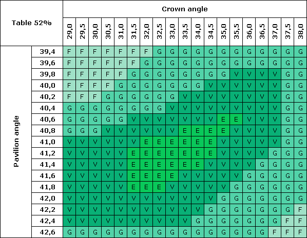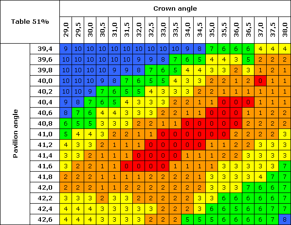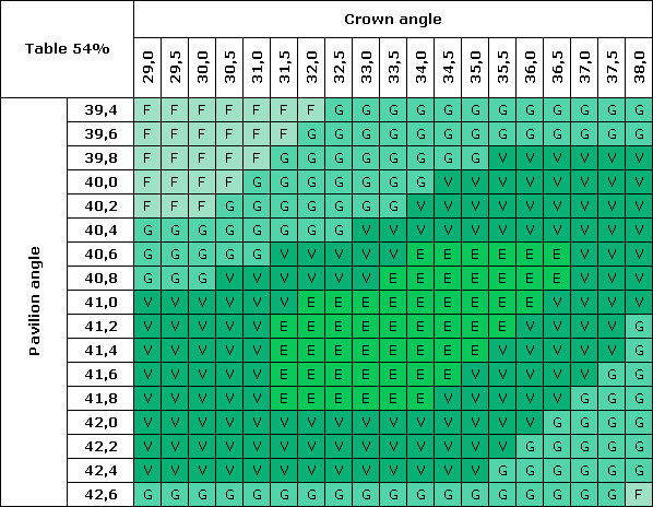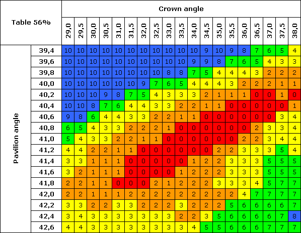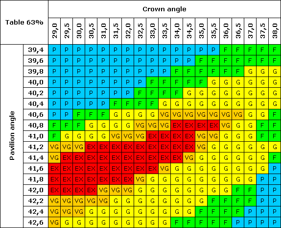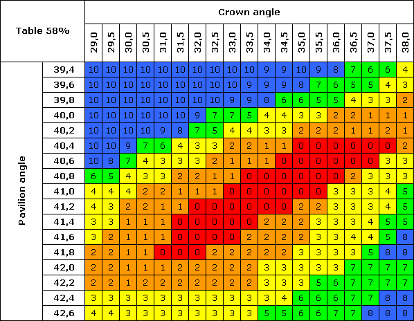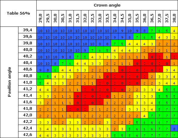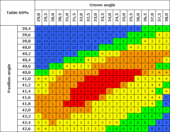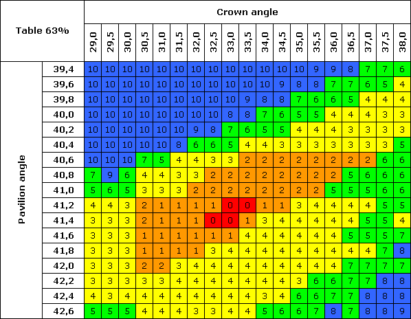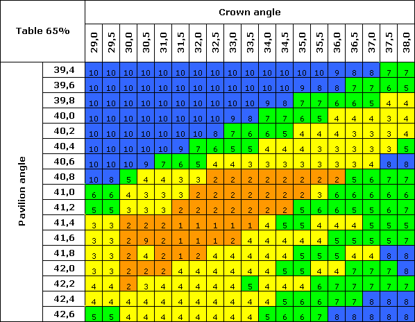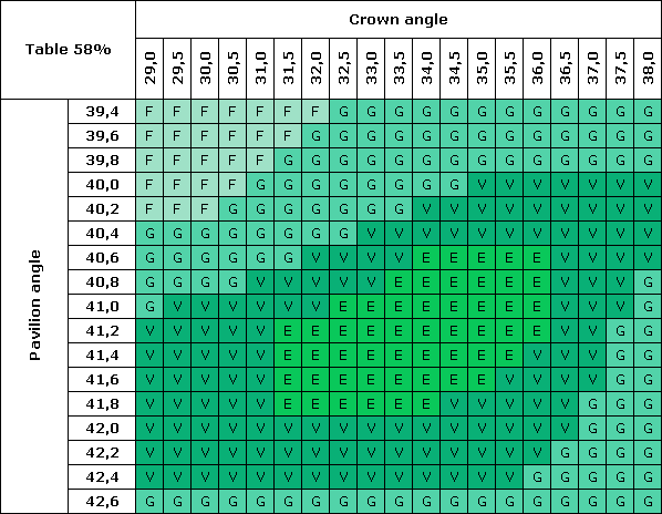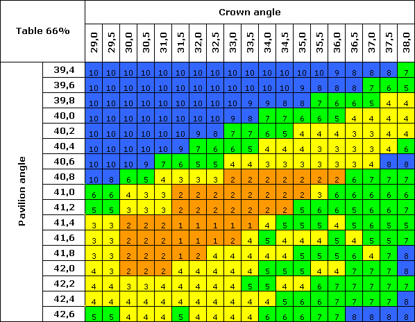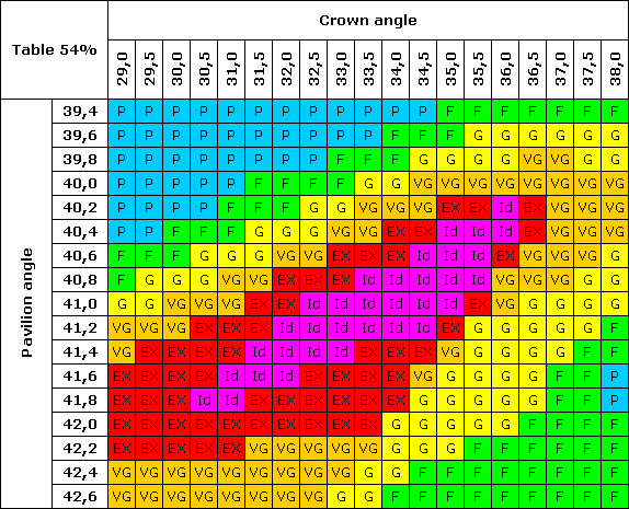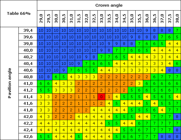 of AGS Performance Grading SoftwareŽ Parameters used in PGS: 3% girdle bezel, 55% Star (45% upper girdle) and 80% lower girdle facet length (81.5% lower facet depth). |