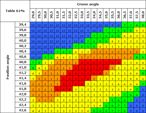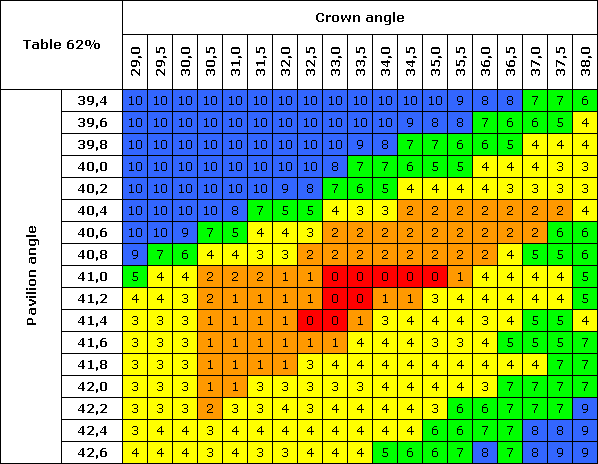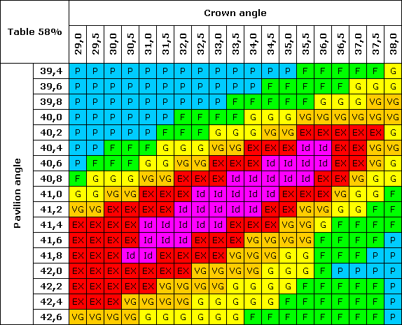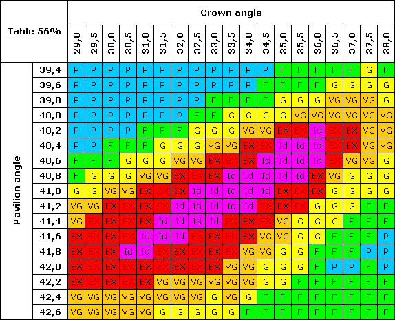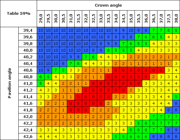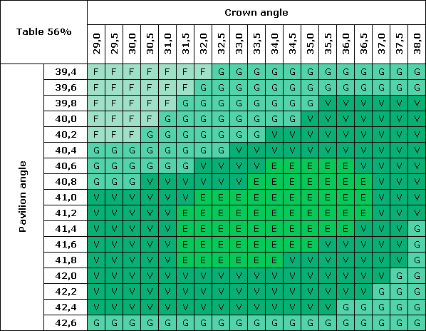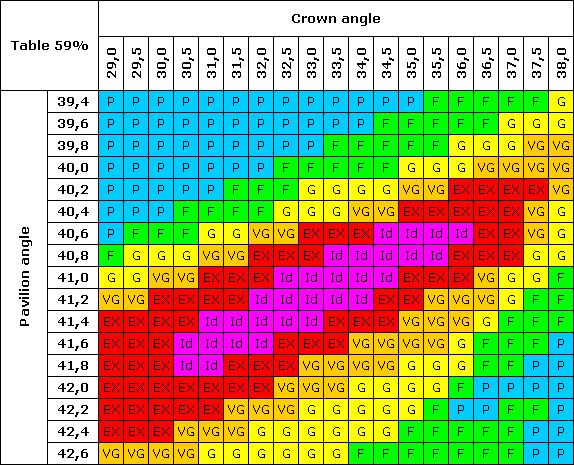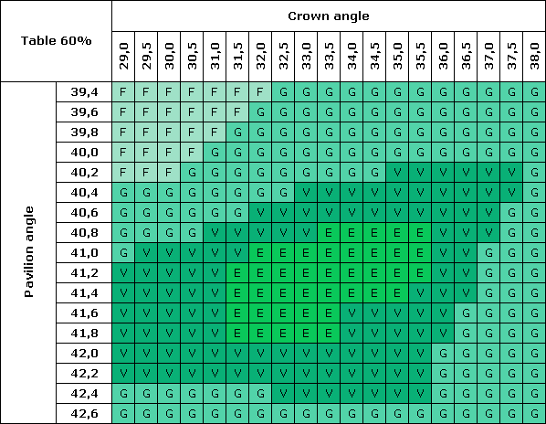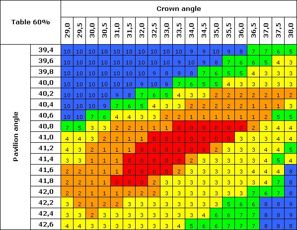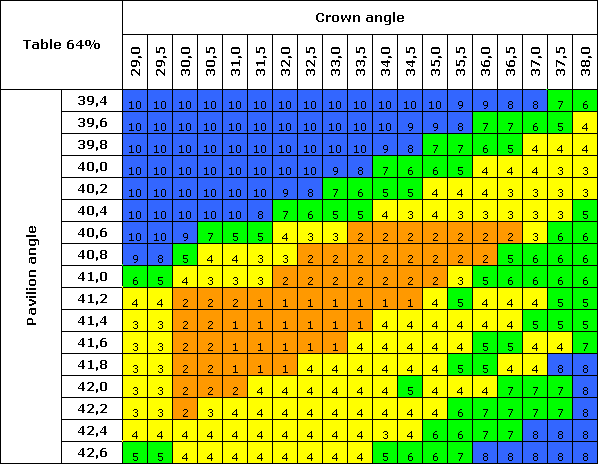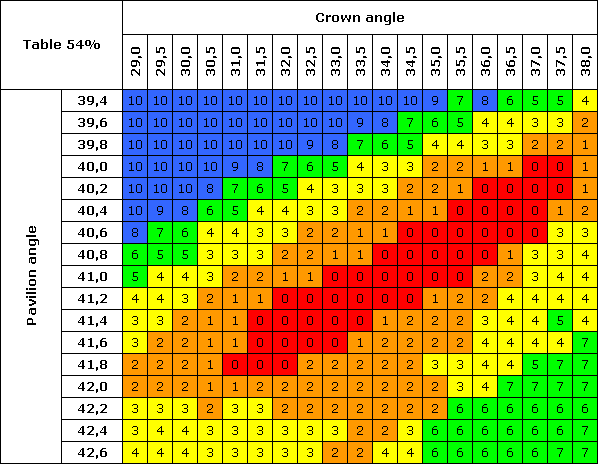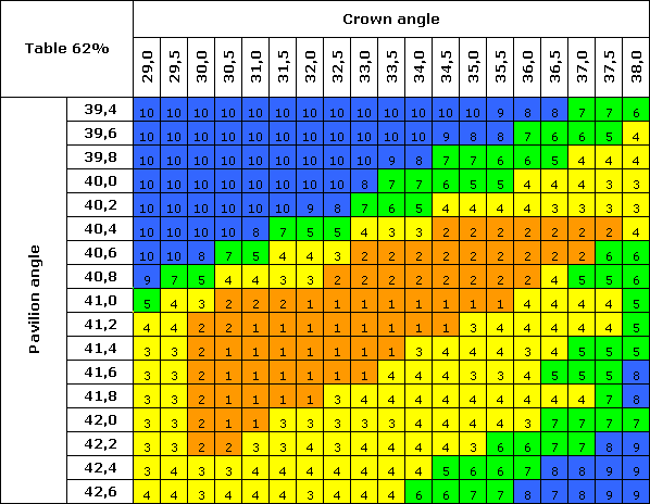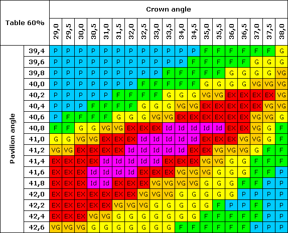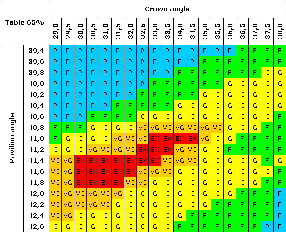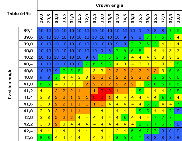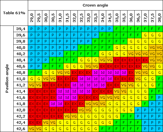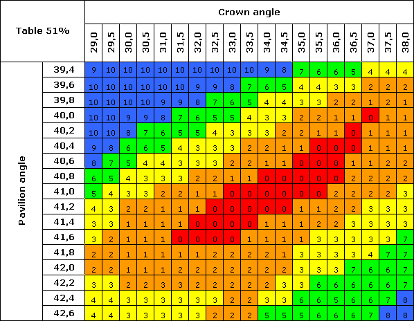 of AGS Performance Grading SoftwareŽ Parameters used in PGS: 3% girdle bezel, 55% Star (45% upper girdle) and 80% lower girdle facet length (81.5% lower facet depth). |