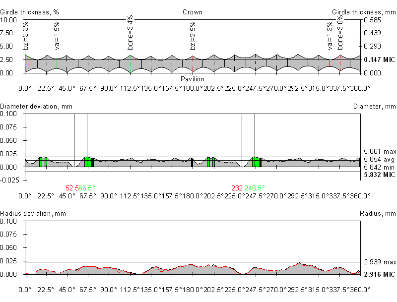 Girdle-Table offset by table axis | 0.13 ± 0.19, % | 0.007 ± 0.011, mm |