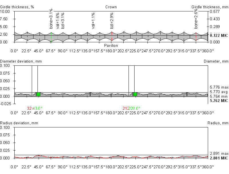 Girdle-Culet offset by table axis | 0.10 ± 0.22, % | 0.006 ± 0.013, mm |