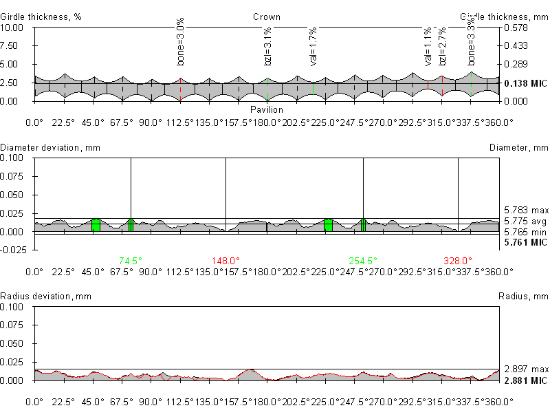 Girdle-Culet offset by table axis | 0.42 ± 0.22, % | 0.024 ± 0.013, mm |