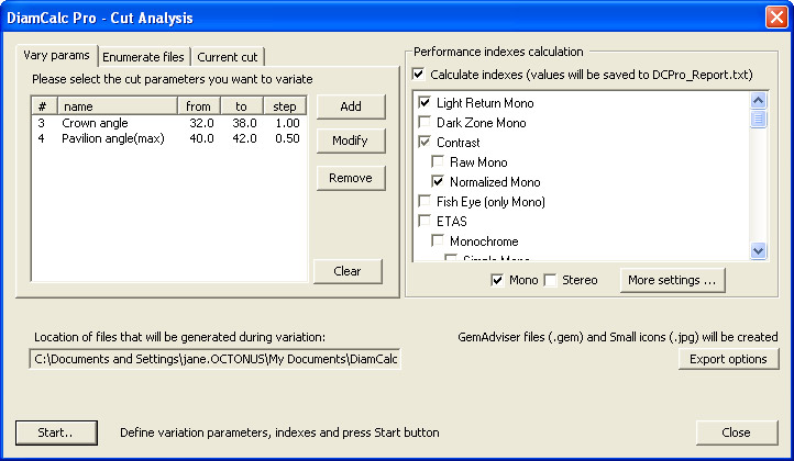 The same operation enables generation of data for any selection from more than 10 basic light performance responses (as shown on the right below). The output data can then be converted to performance graphs and charts (see the example on the next page) for the optimization of the cut being studied to identify the best proportion combinations to achieve maximum brilliance fire and scintillation and good yield for of any diamond.