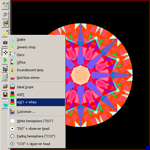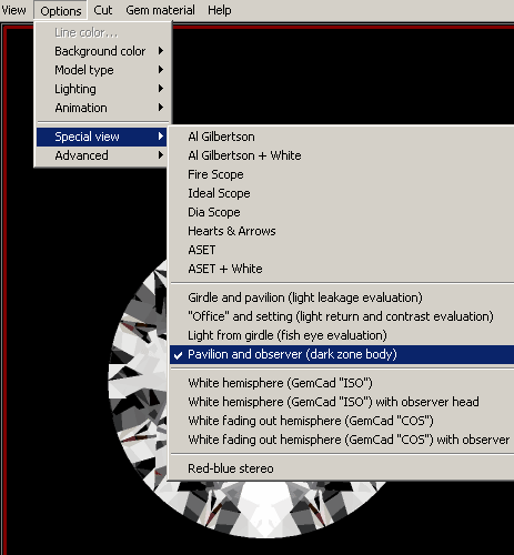 In the window with the model left mouse button rotates the model, right mouse button moves the model, mouse wheel changes zoom. In the edit mode (when "Edit facet types" is checked) use the table of colors to choose the facet type. Press left mouse button on the facet and its type will be changed to the currently selected. Press right mouse button on the facet and the currently selected color will switch to the color of this facet. Color boxes in the table show the quantity of facets of the given type. It may be useful as a quick check, e.g. it is known that the full round brilliant cut should have 8 main facets and 16 halves.