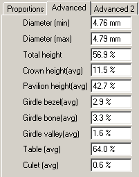 Once you specified types of all facets enter values for extra parameters that you need and press "Calculate report parameters button". DiamCalc will measure stone parameters based on the Cutting type and facet types that you provided. In order to see the result, choose report template from the list and press the "Make report" button.