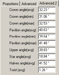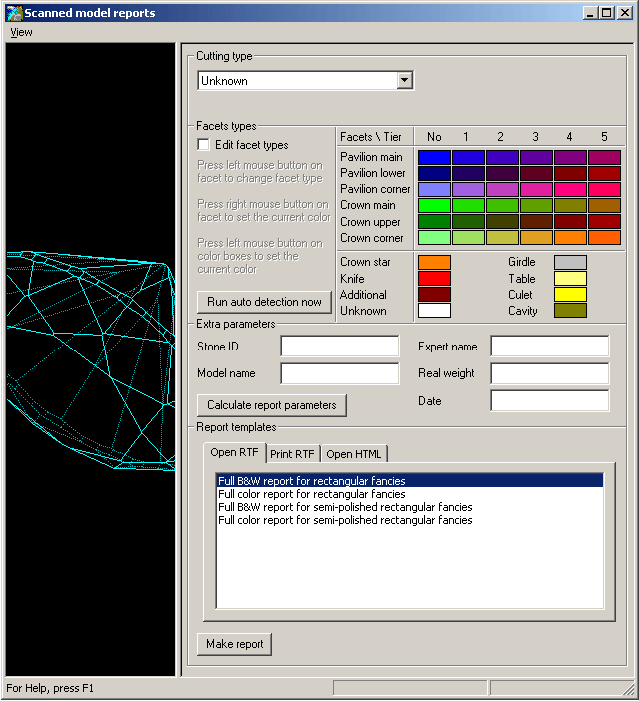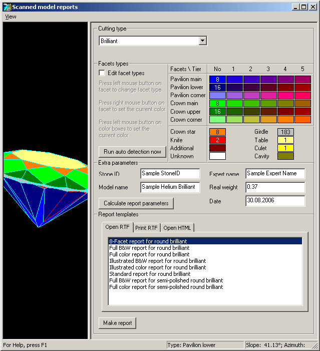 The cutting type of the model is already defined; all facets of the model are colored according to their types. Generally you will not need to alter these. You may adjust extra parameters like "Model name". In order to make a report choose report template from the list and press the "Make report" button. RTF reports require MS Word to be installed. If you choose report from "Open RTF" tab the DiamCalc will fill the chosen template with report parameters and pictures and launch MS Word. If you choose report from "Print RTF" tab the filled report will be sent to default printer and MS Word will close. Reports from "Open HTML" tab will be shown in your default browser.