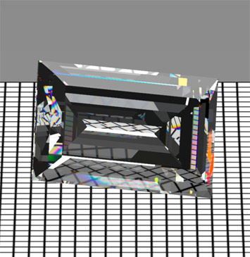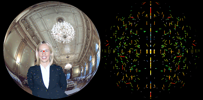 Additional features in new version of DiamCalc include ETAS images (effective total angular size) which at a glance give a good indication of where a diamond can gather light that creates brightness and sparkle. The image on the left shows an ETAS images from the diamonds perspective overlain on the HDR image of the observer placed inside a ballroom. The image on the right is a DETAS image for an emerald cut that shows the dynamic probability to see a sparkle as the diamond is rocked through a small range of north south motion.