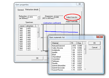 Open panel Gem properties from menu Gem Material -> View / Modify properties… Press button Select from list… The panel Gem material list will open. Where you can find new materials.