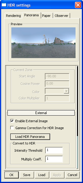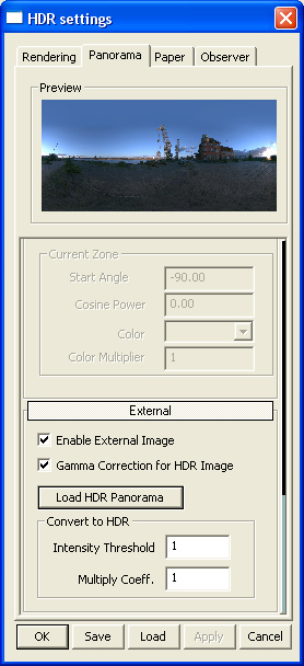Some of HDR panorama images need to be gamma corrected. To make gamma correction select checkbox Gamma Correction for HDR Image in the tab Panorama section External.