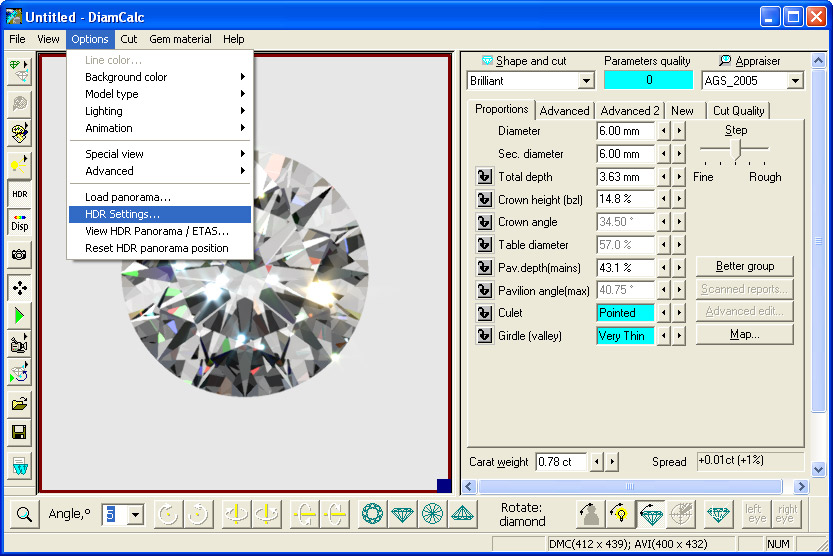 DiamCalc lighting environment can be defined by a high dynamic range panorama, also referred to as HDR panorama. Luminance or radiance observed in the real world can usually be stored in special high dynamic range images that correspond to actual physical values. This additional information makes high dynamic range images that are different to traditional digital images that may appear on a monitor or on a paper print.