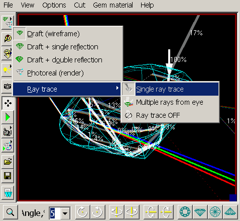 Ray tracing mode is activated or deactivated by menu command Options/Model type/Ray trace or with the "Ray trace" command from the popup "Model type" menu. When the ray tracing activated