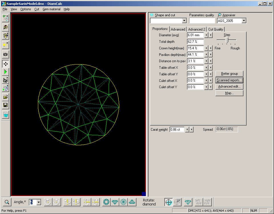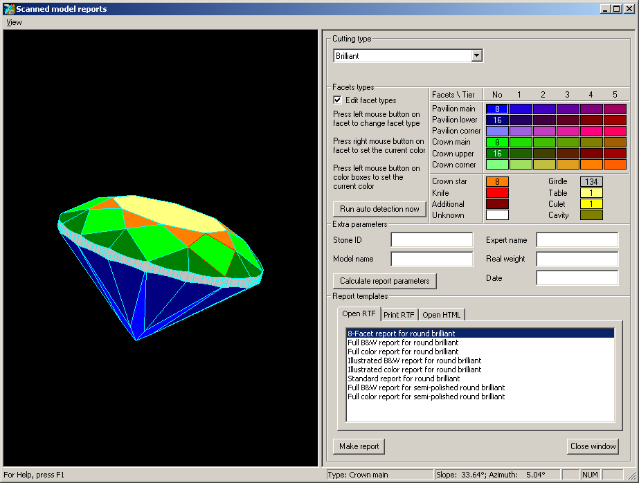 - Press "Calculate report parameters button". DiamCalc will measure stone