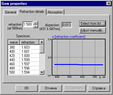 The "absorption" tab (for colored gems) has the same structure as "refraction" tab. It displays the spectrum of absorption on a diagram and allows you to modify it.