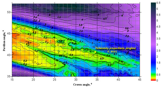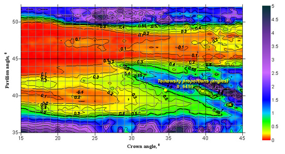 When analyzing these plots, it turns out that they are quite similar to plots of diamond's Light Return. This fact is absolutely reasonable, because the Light Return through the crown and the light leakage through the pavilion should be interrelated. At the same time, some differences can be noticed, the most interesting one corresponding to the region close to the Tolkowsky's cut parameters (slightly upper on the plot than these). This region looks good from the point of view of Light Return but much worse from the point of view of light leakage. When studying gems belonging to this cut parameter range, one can notice that their Light Return is high only in the «crown looks to the observer» position. When swinging such a stone, its Light Return appears to be lower than that of a diamond cut in accordance with the Tolkowsky's parameters.