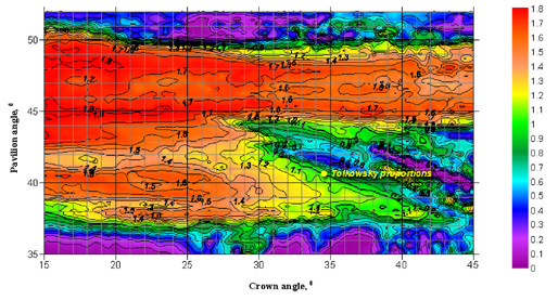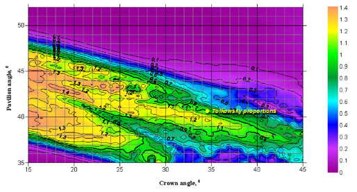 Plot 1. Light leakage through the crown of a round brilliant cut diamond with a table spread of 57% and a girdle thickness of 1% as a function of the crown angle and the pavilion angle. The distance between the photoreceptor and the diamond is 60 cm. The plot is based on the image observed by photoreceptor. The diamond is oriented so that the table looks towards the observer. The larger the leakage value plotted, the stronger the leakage effect and the lower the quality of the diamond. |