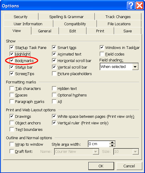 when all bookmarks are visible. To make the bookmarks visible in the document choose menu "Tools" - "Options" - "Bookmarks":