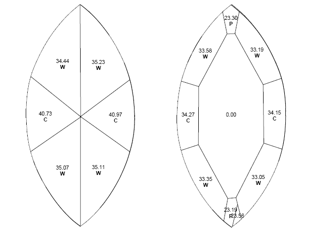 - Pavilion views of the diamond with indication of facets' slope angles [degree] - PAVILION_SIDES_SLOPE_REPORT_CL
