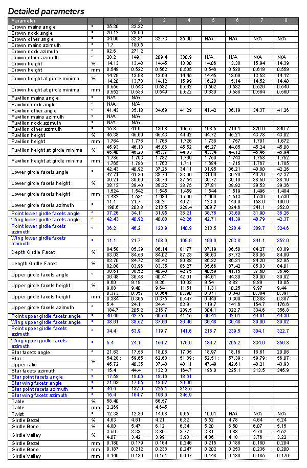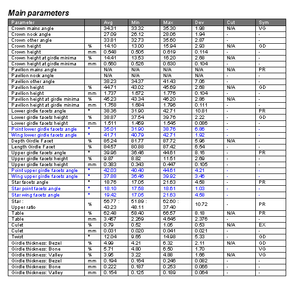 - Information about slope angles for the large visible facets (main facets and halves facets) on the pavilion and crown