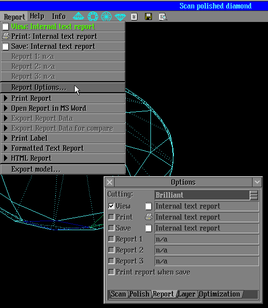 Open panel "Options", section "Report" (find [Scan polished diamond\Report\Report options...], see Figure 2).