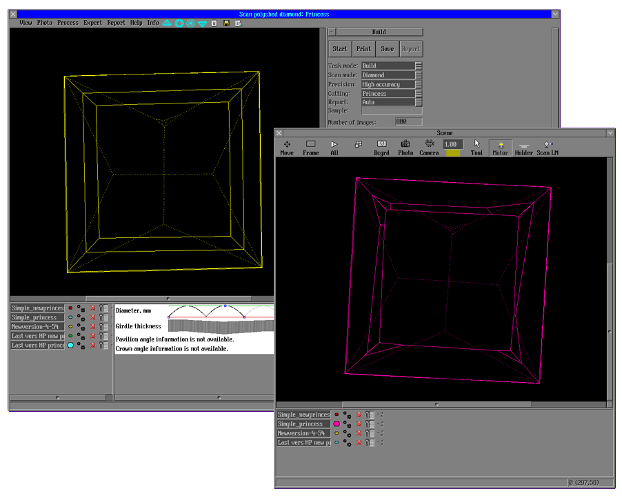 The software defines Cushion Girdle thickness types based on custom structure of a cushion girdle. Cushion girdle is divided by types: Red, Yellow, Green and Blue, than Girdle thickness is calculated for these types.