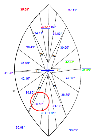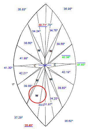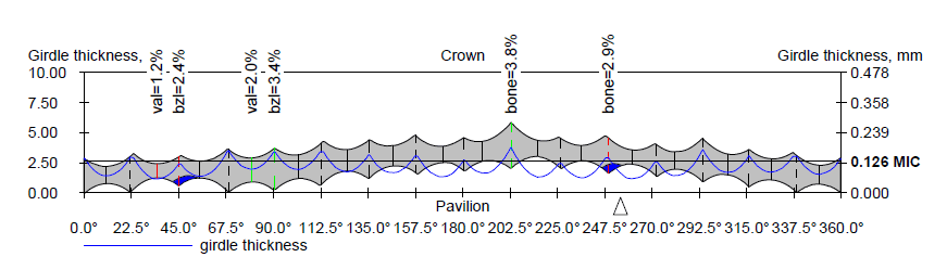 Girdle thickness values are output into the Girdle thickness plot as colored lines in red, green, yellow and blue colours. Red girdle thickness are also outputs in numerical values on plot and indicated by W - Width, L - Length and C - Corner. For example, W=3,8%, opposite red line near 180 degree of azimuth is corresponding to Girdle thickness Width Red type parameter from column 1 of Girdle thickness table.