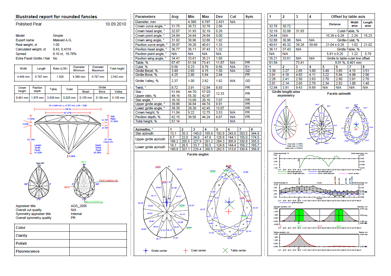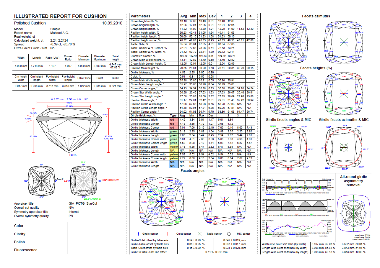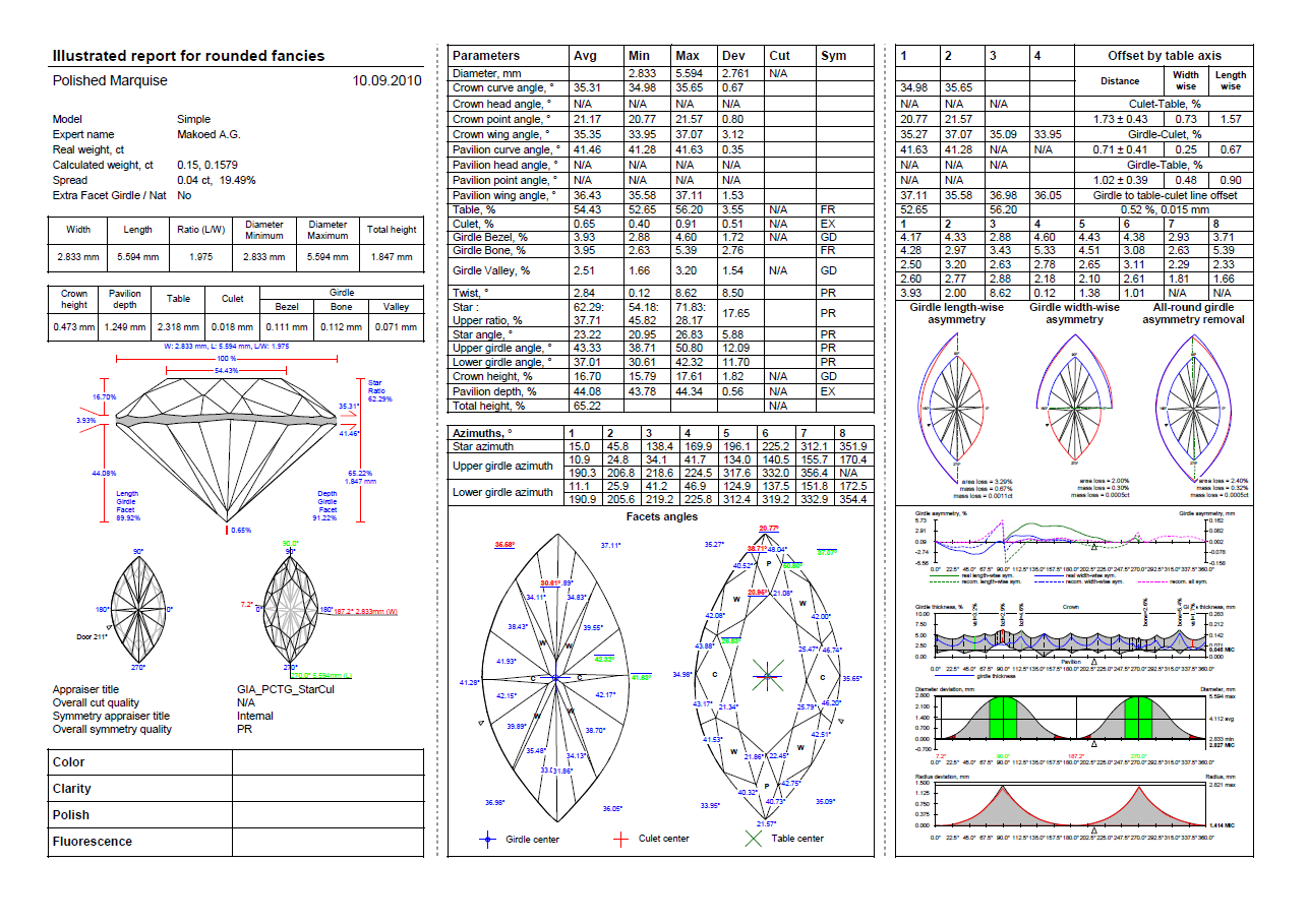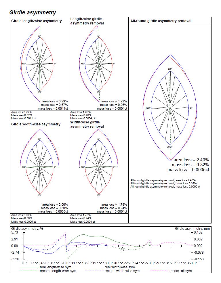 The special illustrated one page report for marquise and oval also contain pictures with real Girdle lenght-wise asymmetry, real Girdle width-wise asymmetry and recommendation for removing all round asymmetry.