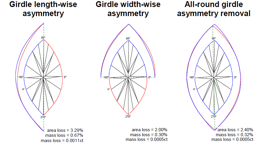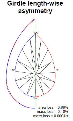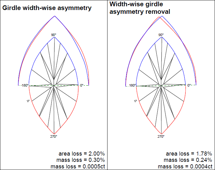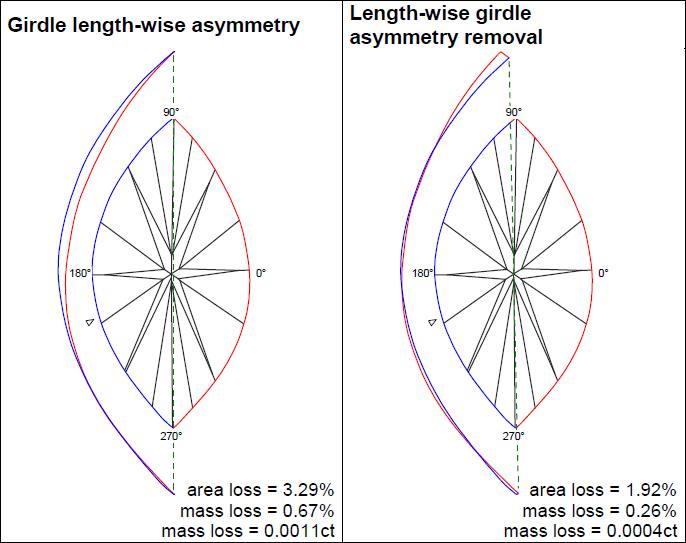 For left picture Girdle Length-wise asymmetry: if you grind off stone and make it symmetry you will loss 3,29 % area and 0,67 % mass.