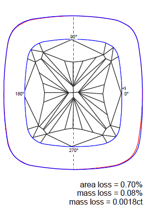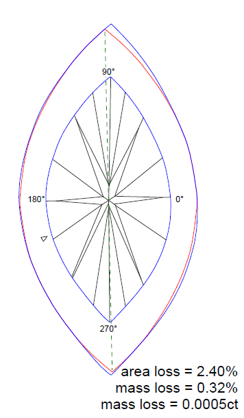 If you like get ideal symmetry stone - you should grind off parts between blue and red lines. You will loss 2,40 % area and 0,32 % mass in this example, but get ideal symmetry diamond.