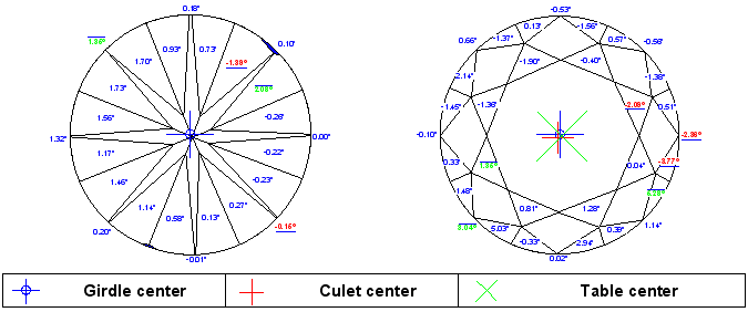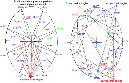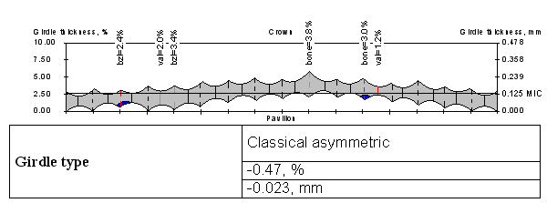 - Upper there is information about stone crown: angles and heights (in mm and in %) opposite facets (in case of main