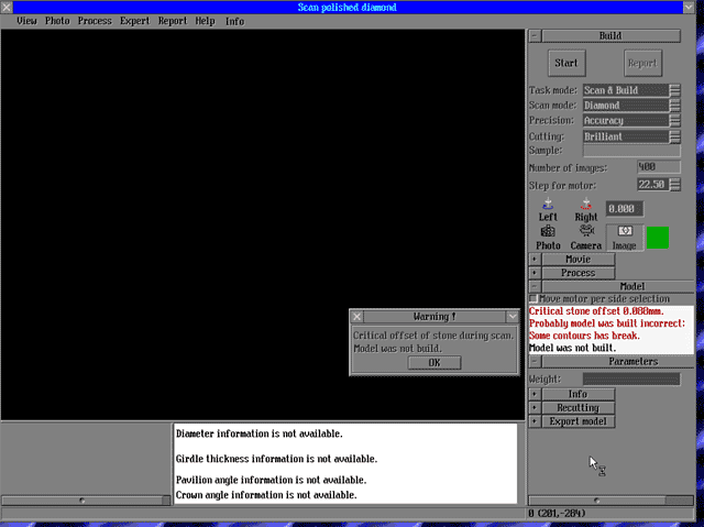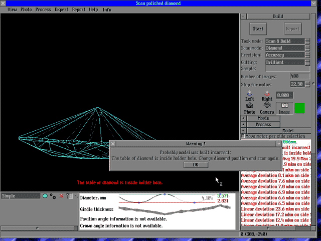 - Automatic diagnostics of hit of the vertex of Table facet of scanned diamond to the holder hole