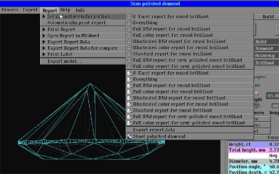 Menu Report was changes in new version. Thus it consists of reports for semipolished diamonds and improved reports for fancy cuts (see figure 5).
