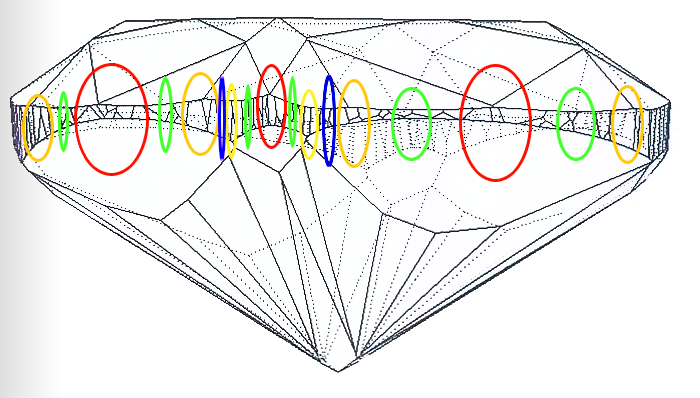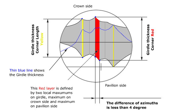 For example, on the picture measurements of Girdle thickness Corner Red maximum and Girdle thickness Corner Length Yellow maximum are illustrated: