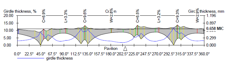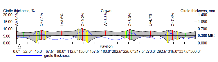 Girdle thickness values are output into the Girdle thickness plot as colored lines in red, green, yellow and blue colours. Red girdle thickness are also outputs in numerical values on plot and indicated by W - Width, L - Length and C - Corner. For example, W=3,8%, opposite red line near 180 degree of azimuth is corresponding to Girdle thickness Width Red type parameter from column 1 of Girdle thickness table.