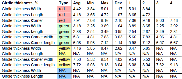 Girdle thickness is divided by Red, Green, Yellow and Blue types and inside these types into Width, Length and Corners groups.