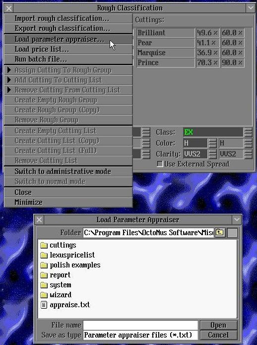 Option of addition of pricelists and appraisers in the running program became more easy and comfortable. It is available from the panel "Rough Classification" using commands "Load Parameter Appraiser..." and "Load Price List..." from the pop-up menu by pressing by right mouse button on the "cross".