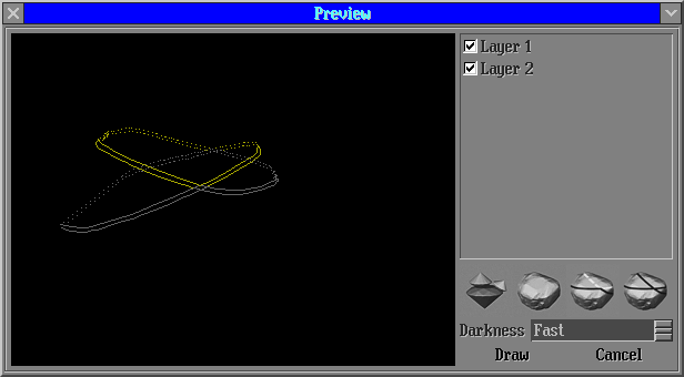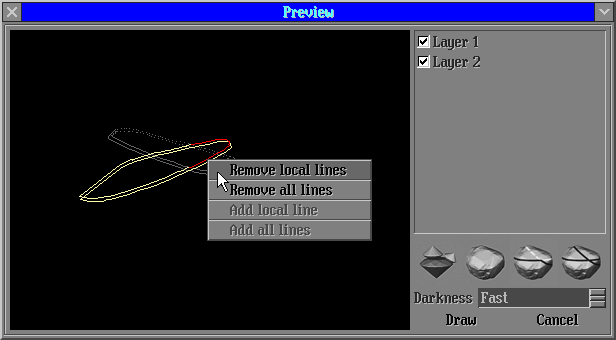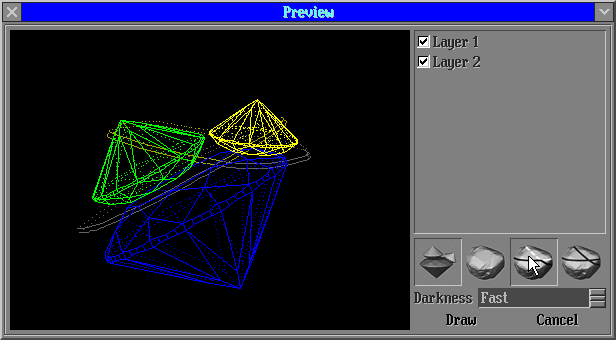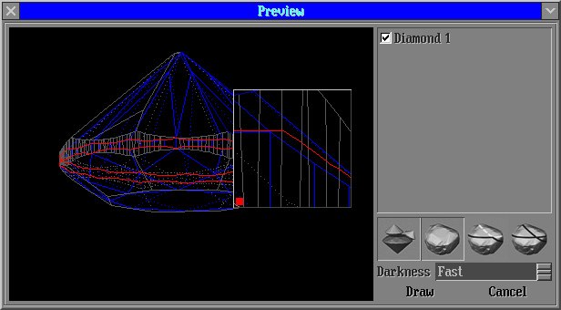 The panel Preview draw lines will be opened. This panel contains 4 buttons: "visualization polished diamonds", "visualization rough model", "automatic remove lines from layer which intersect polished diamonds" and "restore original lines". The button "automatic remove lines from layer which intersect polished diamonds" allows remove unnecessary lines in automatic mode.