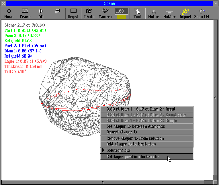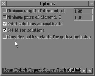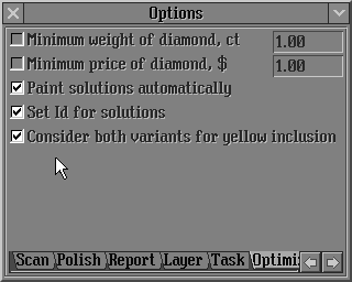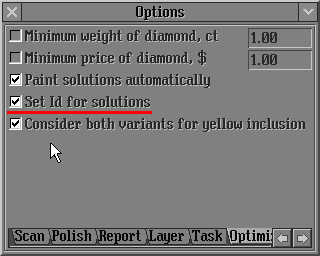 1) New behaviour of algorithms Swim, Bound Swim, Recut and etc allows obtain the solutions without worsening of clarity. Before an optimization process yellow inclusions around the diamond are marked as green if its clarity are the same as the diamond clariry or its clarity are better; and are marked as red if inclusions clarity are worse then the diamond clarity.