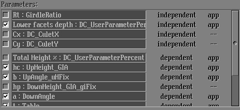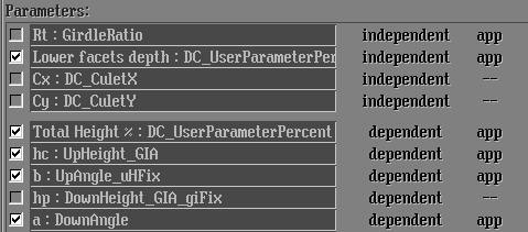 Rt parameters (Rt:Girdle Ratio), Culet shifts parameters (Cx:DC_CuletX and Cy:DC_CuletY) and all Metric parameters must be switched off in the Parameters list.