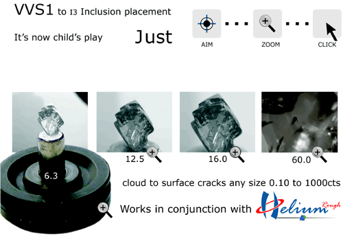 Plotting of Inclusions Making set of photos on Helium Rough scanner. Then inclusion including VS to I can be plotted manually on M-Box/Helium Rough photos. Helium IG (HIG)