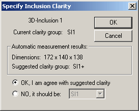 Press the button "Specify Clarity" when the inclusion is localized. The program will made approximate measurement of inclusion and suggest the clarity group. By default all newly created inclusions are SI1: