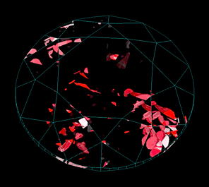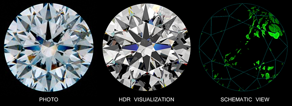 Photorealistic view (diamond and inclusions) Inclusions view (increased contrast for enhanced inclusions visibility)