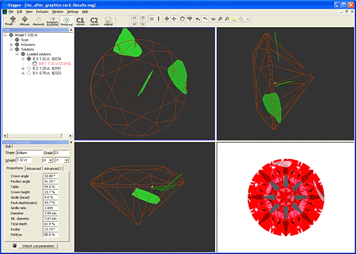 Warning! The HDR photorealistic diamond and inclusions visualization requires Graphics hardware supporting specific features. Please test your GPU (Graphics hardware) with DiamCalc - Graphics Compatibility Evaluator utility. This utility will attempt to render a reference data set in order to check if your Graphics hardware is compatible with new OctoNus HDR rendering engine. Even if you get negative test result the non-HDR visualization will be available in the program. Most of existing Windows computers is compatible with non-HDR OctoNus rendering engine.