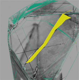 Algorithm constructs shape of curved crack by surface line and 3D points. The perpendiculars are put from 3D points in the deep of stone to Surface line. The other directions are constructed by interpolation (see illustration below). The final crack shape is defined by crack's Outline.