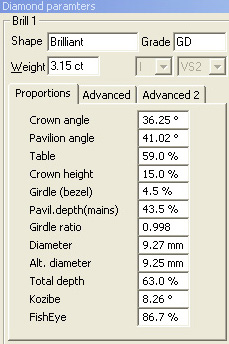 2. Full parameters list panel with the Cut grade, Clarity and Color is available