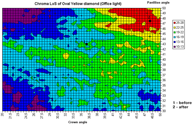 Calculation result for the Chroma metric of oval cut. Crown and pavilion angles were changed. Point 1. after allocation and before color optimization. Point 2. after color optimization. Chroma metric is higher. |