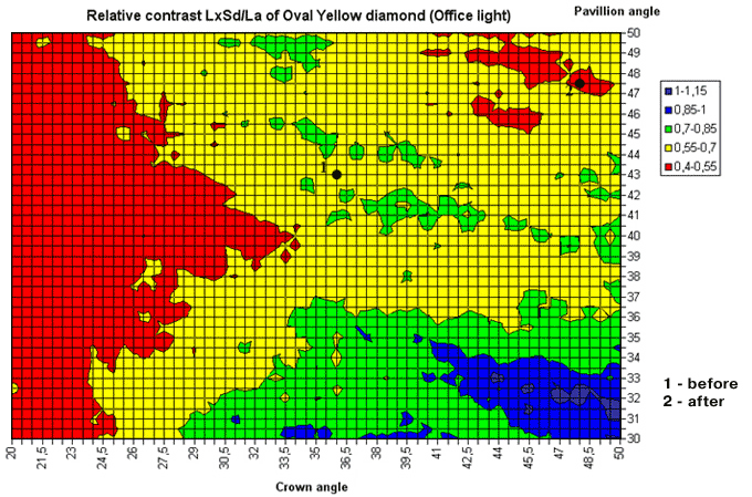 Another important metric is contrast: the lower contrast the better color appearance. This diagram shows the relative contrast function in the same coordinates for the sane stone in the same lighting. Point 2 again better than point 1. This solution will be also better for yield. |