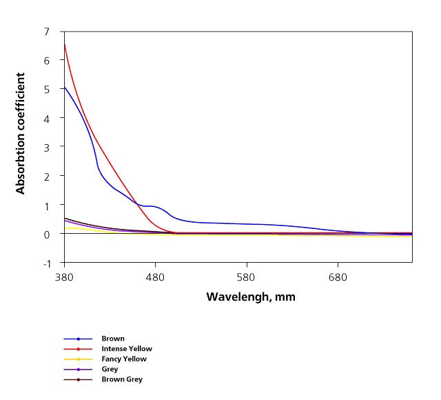There is a method to record an absorption spectrum is the visible wavelength range and calculate the absorption coefficient for each wavelength. These data can be used to numerically describe the plate's color in any color system. The best way to get quantitative spectral data is to record spectrum through two parallel windows polished on the rough piece. There are various absorption spectra for different diamonds and we can see examples here. |