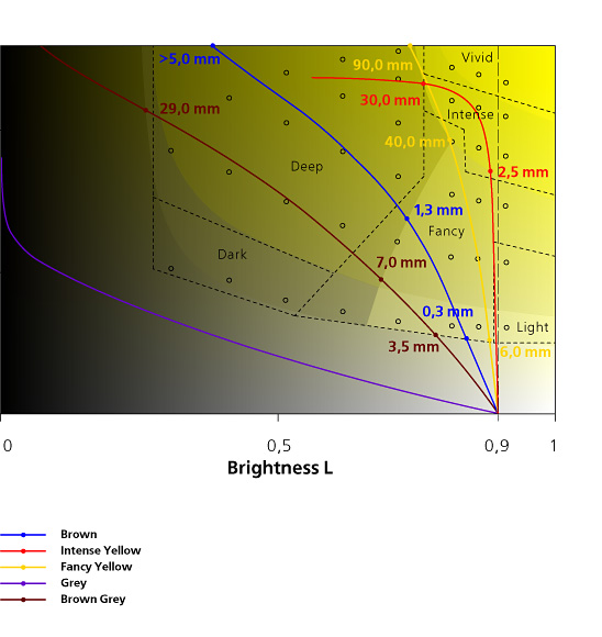 A good colored diamond should have both high brightness and saturation. On the Brightness/Saturation diagram of the fixed yellow hue one can see yellow colors of different brightness and saturation. These colors are tending to be near the upper right corner.