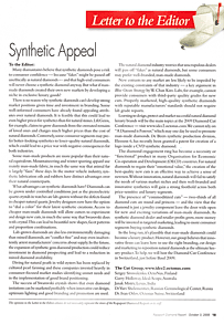 What advantages can synthetic diamonds have? Diamonds can be grown under controlled conditions just as the piezoelectric quartz crystals in watches are lab-grown without the defects found in cheaper natural quartz. Jewelry designers now have the option to "dial a color" for their latest synthetic creations. Access to cheaper man-made diamonds will allow cutters to experiment and design new cuts, in much the same way that Swarovski does with crystal. This can lead to beautiful new shapes, facet patterns and proportion combinations.